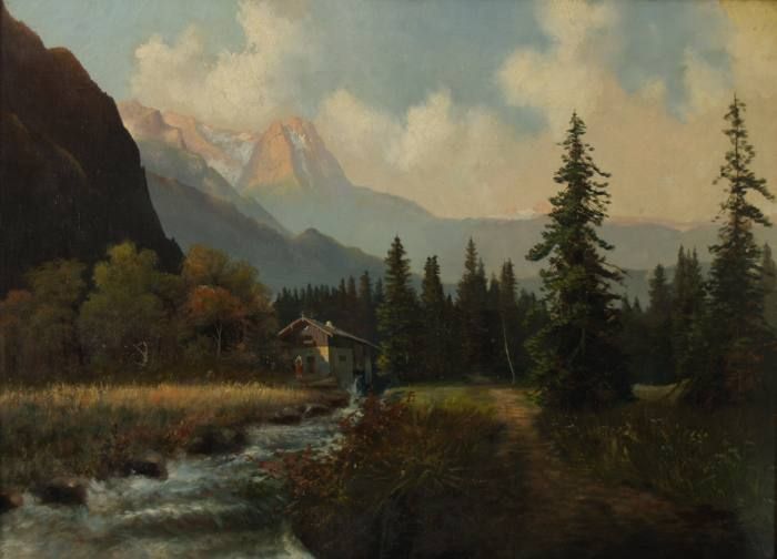 Gebirgslandschaft mit Bachlauf und Gebirgsmassiv