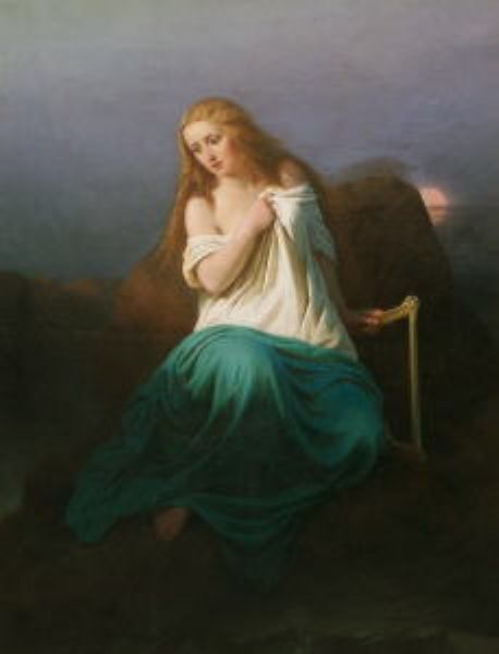 Die Loreley mit Leier auf Felsvorsprung am Rhein vor untergehender Sonne