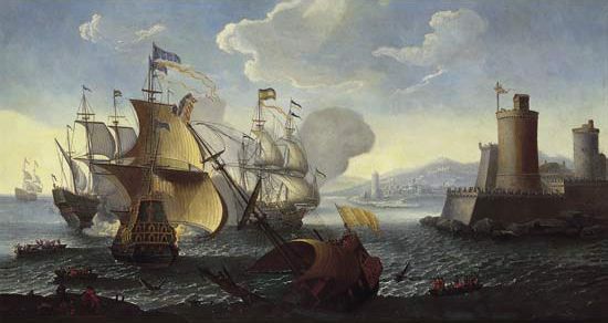 Bataille navale aux abords d'un port fortifié