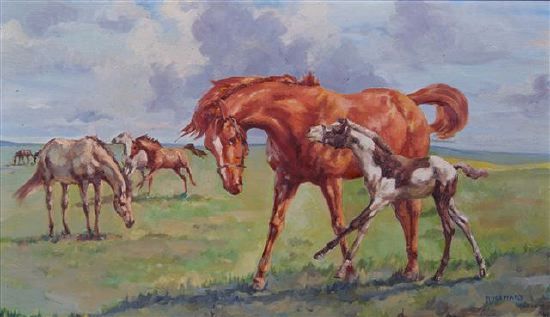 A similar equestrian study in an open landscape, with horse and foal in foreground