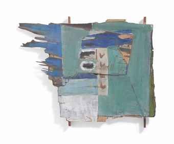 Oil on wood collage and metal screws on wood