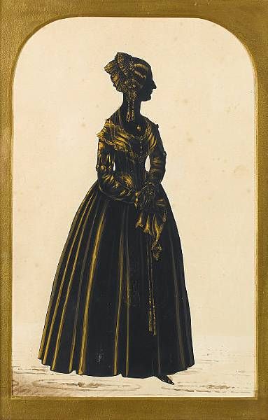 | A pair of silhouettes of a Lady and Gentleman, full-length; she, profile to the right, wearing dress, lace headdress and holding | |