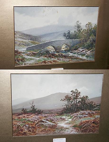 A pair of moorland scenes, `Hunt Tor', and a scene of figures on a bridge spanning a stream,