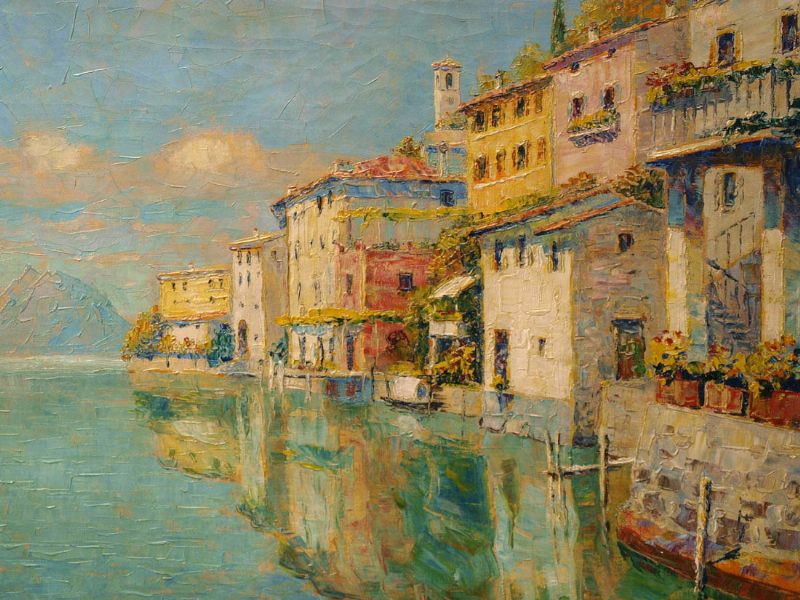 Uferpartie an einem oberitalienischen See, im Hintergrund die Höhenzüge der Alpen