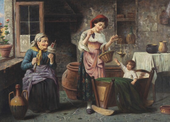 Interior with mother feeding the child grapes and grandmother spinning yarn by the window