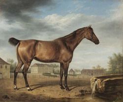 Porträt einer braunen Vollblutstute vor der Kulisse