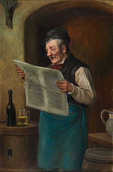 Tagesneuheit. Schankwirt beim Lesen in der Tageszeitung. In Wirtsstube
