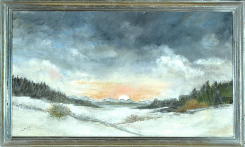 Winterlandschaft mit Bergkette im Hintergrund bei Sonnenuntergang