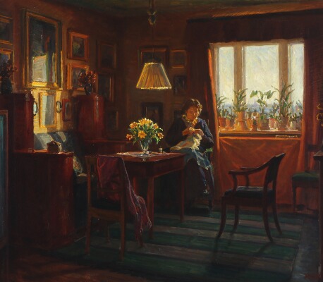 An interior with a woman sewing