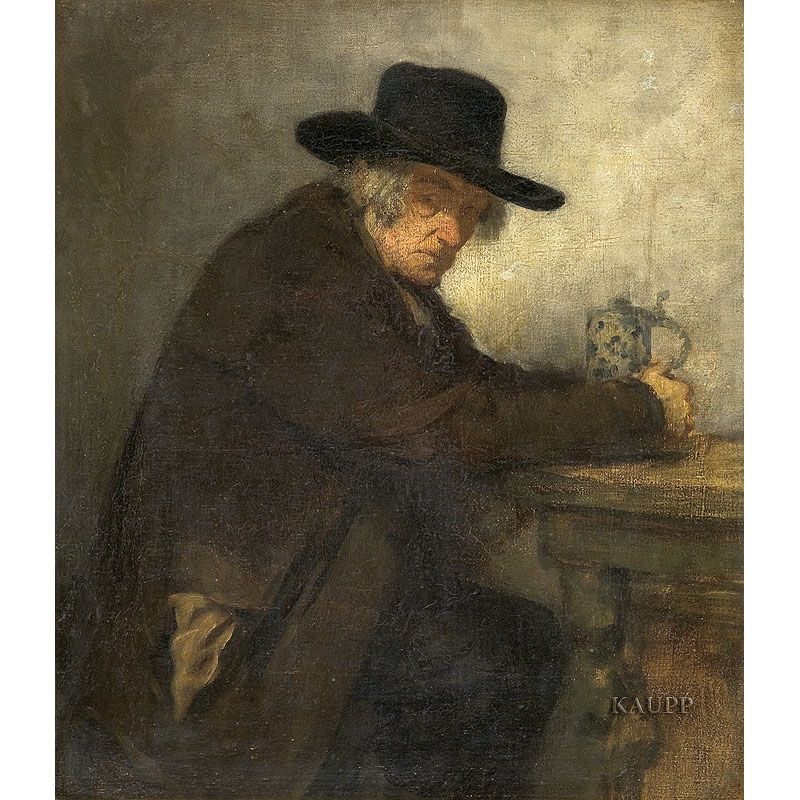 | An einem Tisch sitzender Bauer mit dunklem breitkrempigem Hut, mit seiner rechten Hand einen Humpen haltend und den Kopf zum Bet | |