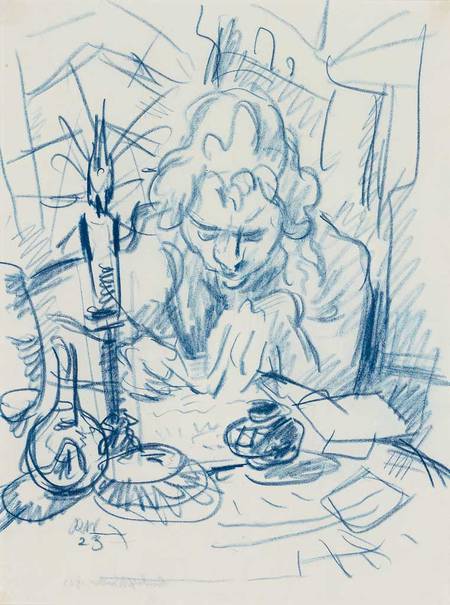 Wackers wife Ilse at the table by candlelight writing a letter.