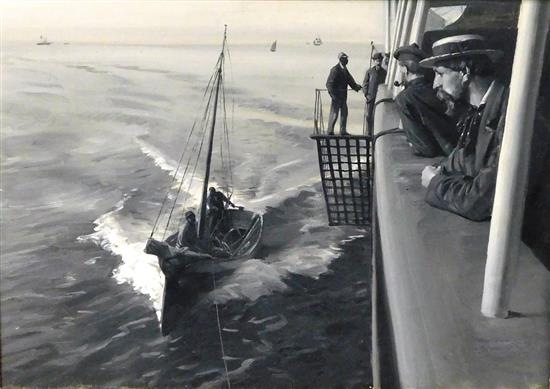 | grisaille seascape depicting small sail boat approaching larger vessel with on-looking passengers | |