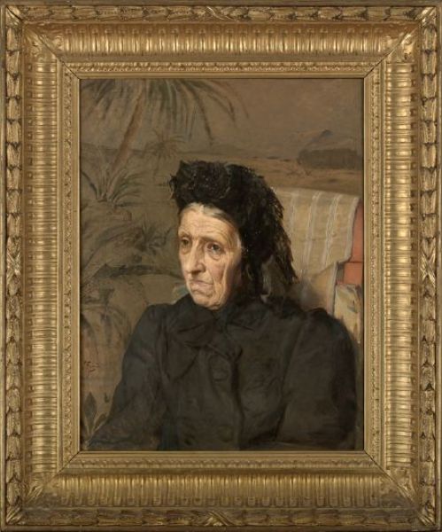 | Bust Portrait of an Elderly Woman Dressed in Black Seated Near Palm Trees | |