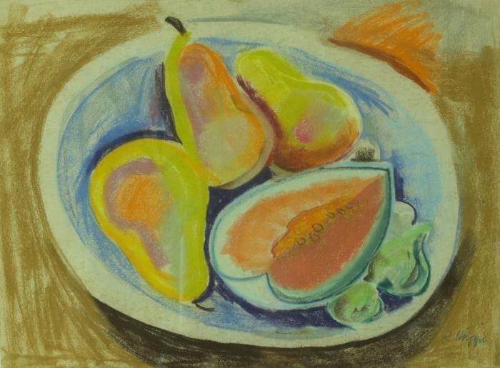 Früchtestilleben. Melonen, Birnen und Feigen in Schale
