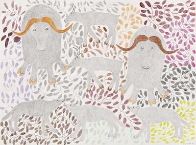 Baker Lake, Untitled (Caribou, Muskoxen and Wolves in a Landscape)