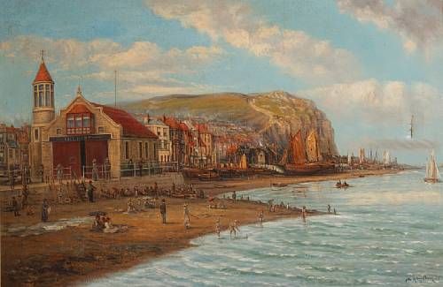 | A view of Whitby, with lifeboat station, and figures on the beach to the foreground | |
