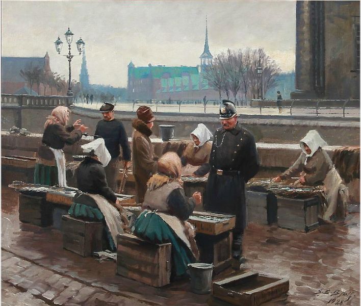 Fishermens' wife selling fish at Gl. Strand in Copenhagen.