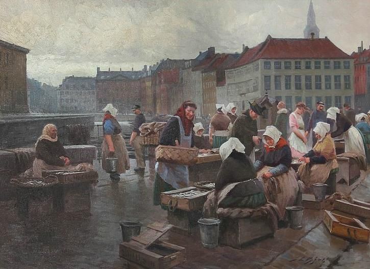 Fishermens' wife selling fish at Gl. Strand in Copenhagen.