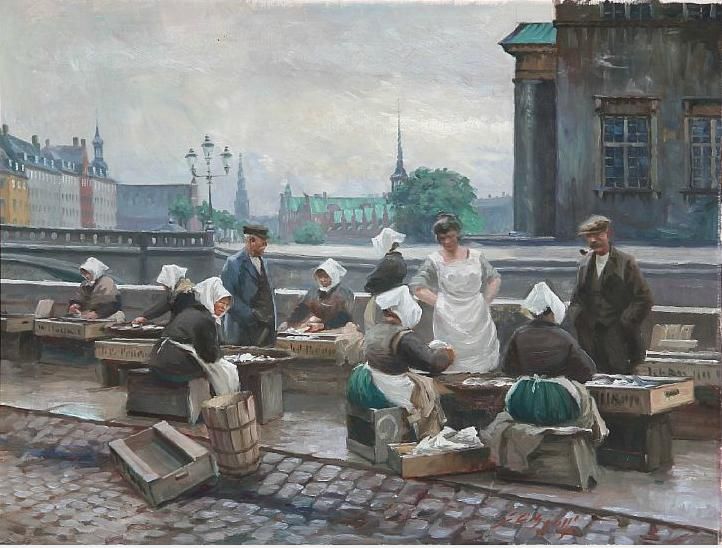 Fishermens' wife selling fish at Gl. Strand in Copenhagen.