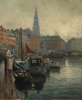 View from Gl. Strand in Copenhagen with moored fishing boats