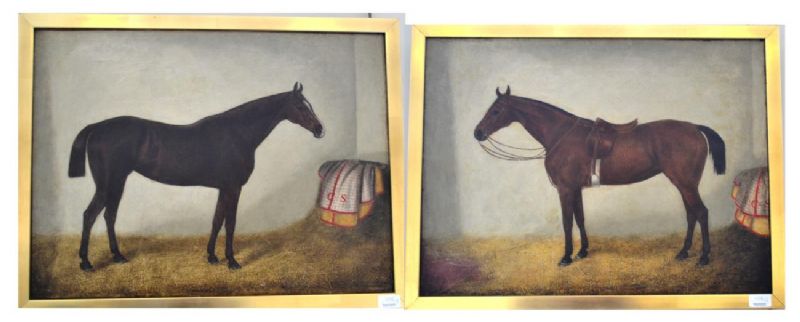 | Study of a bay horse in a stable and study of a liver chestnut horse standing in a stable | |