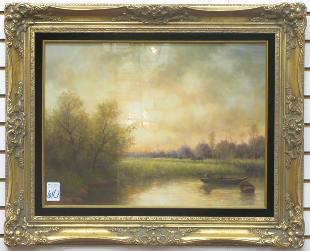| depicting a pastoral landscape at dusk with a fisherman in a boat in the foreground and cattle grazing in the background | |