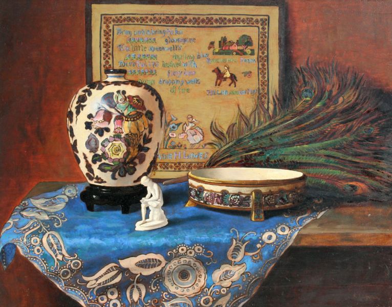 Still Life of Porcelain Jardinere with Peacock Feathers