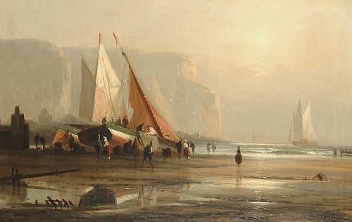 Fishing boats on a beach with cliffs beyond