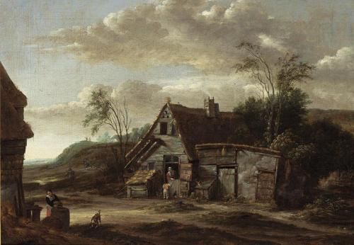 | A DUNE LANDSCAPE WITH A FARM WITH A WOMAN AND A CHILD AT A DOOR | |