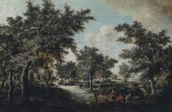 A wooded landscape with falconers on a path