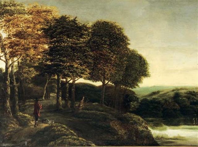 A wooded river landscape with a hunter and his dogs on a track