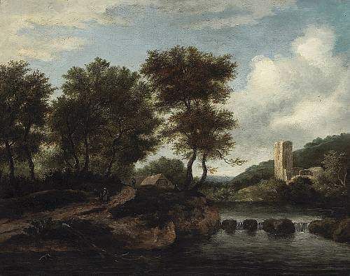 A river landscape with figures on a path