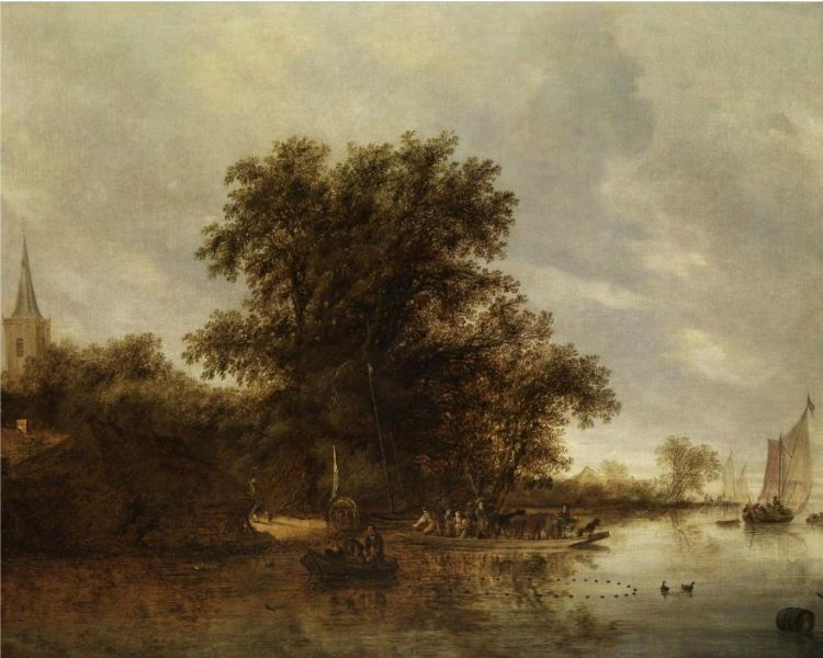 FLUSSUFERLANDSCHAFT MIT FÄHRBOOT UND KÄHNEN VOR HOHEM BAUM