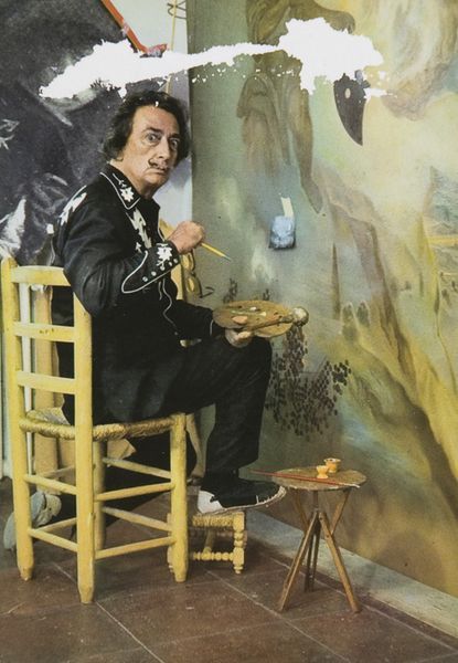| Dibujo a bolígrafo sobre una postal que representa a Dalí pintando. | |