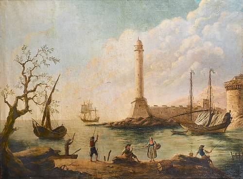 | A coastal inlet with anglers on the shore in the foreground, shipping moored beyond | |