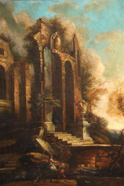 | Classical ruins with a figure and two horses; Classical ruins with two figures (a pair) | |