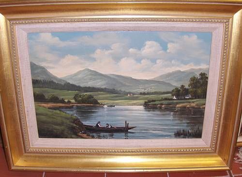Rural river landscape with figures in a punt