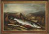| Oil on canvas scene shows the success of a fishing day with a large salmon and four trout | |