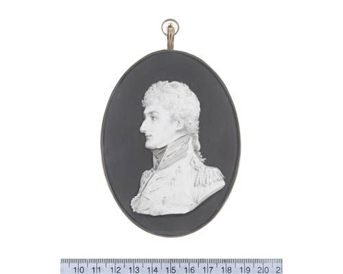 | An Officer, bust-length, profile to the left, wearing coat with lace, epaulettes and standing collar, chemise and stock | |