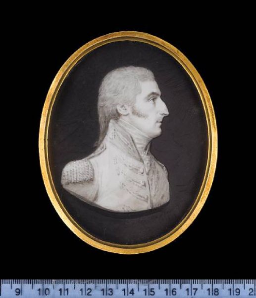 | Lt. James Armstrong (d.1812) of the 10th Regiment of Foot, profile to the right, wearing braided coatee with epaulettes over fri | |
