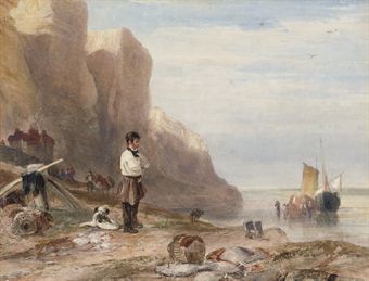 | A man and his dog before the East cliffs, Hastings | |