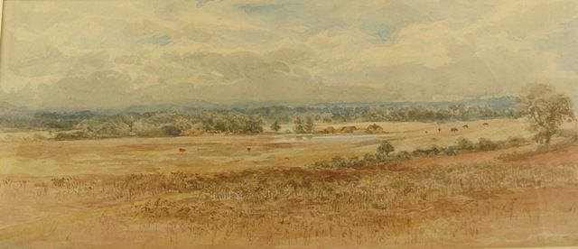 Earlswood Common with farm buildings by water and a distant tree line