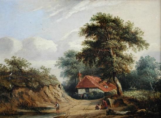 A Gypsy Family with a Fisherman Fishing outside a Cottage