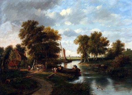 | River Scene with Figures Loading Timber onto a Wherry, Horse and Cart by a Cottage | |