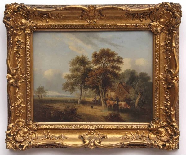 Country Landscape with figures, donkey, dog and cattle by a cottage