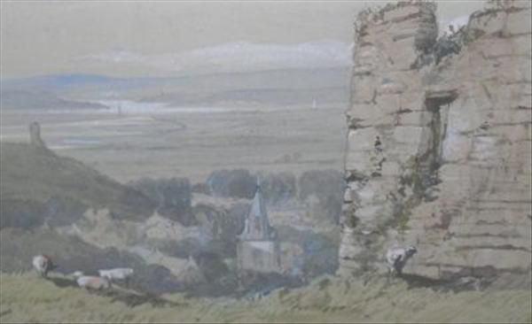 Sheep before a ruin and estuary
