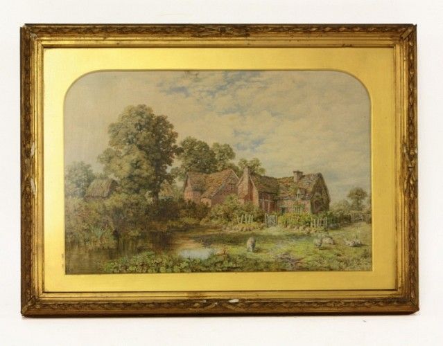 A LANDSCAPE WITH A COTTAGE, POND AND GRAZING SHEEP