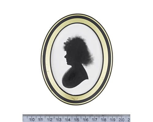 | A silhouette of a Lady, profile to the left, wearing fichu and ribbon bow in her curled hair | |