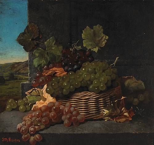 | A Stone Ledge with a Basket of Grapes and Rolling Hills in the Distance | |