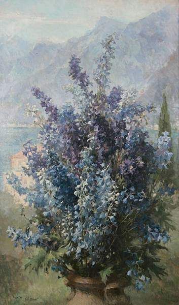 Vase of hollyhocks, with mountainous background